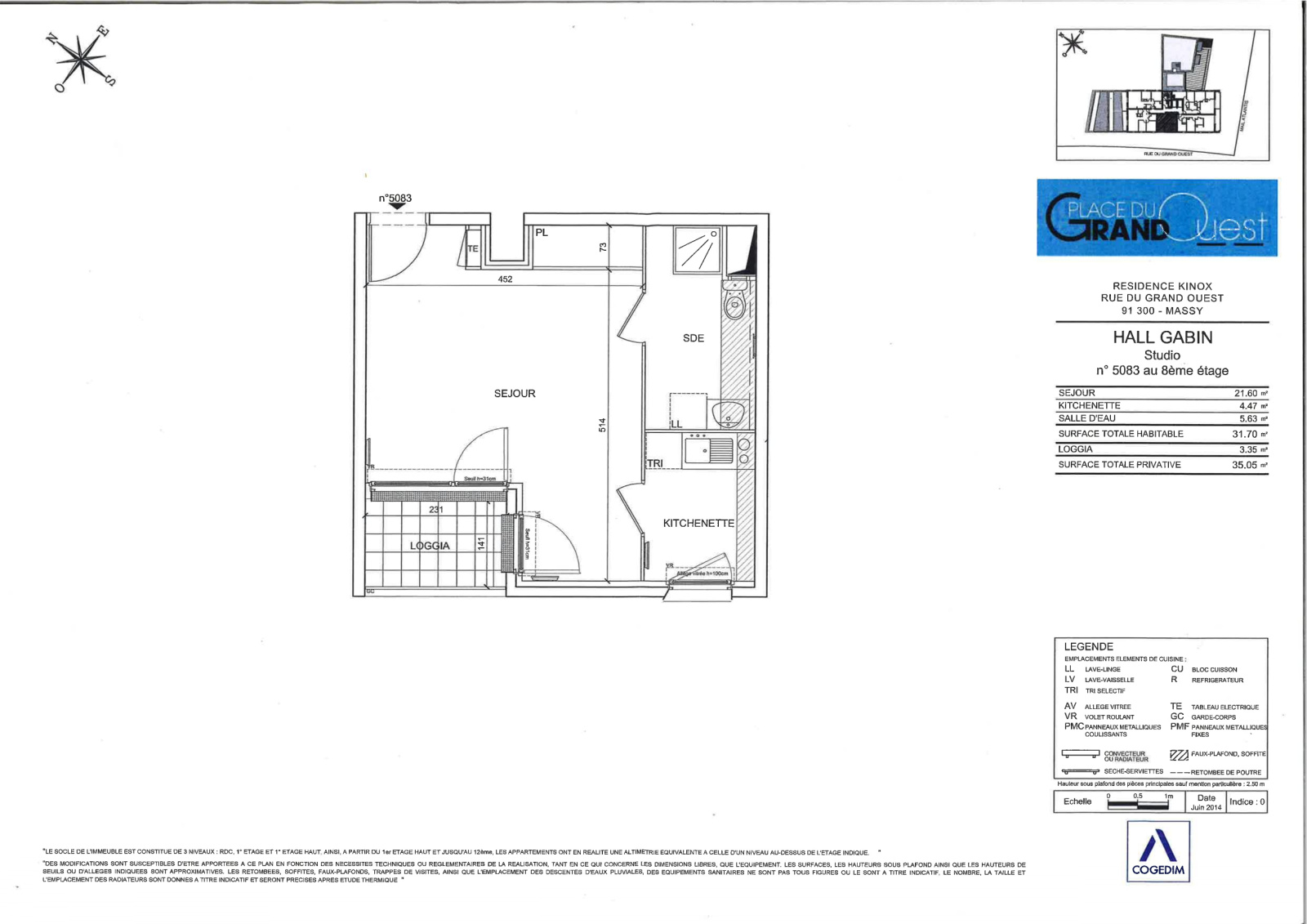 À MASSY (91300) PLACE DU GRAND OUEST, QUARTIER ATLANTIS, proche GARES RER B-C MASSY-PALAISEAU, MASSY TGV, écoles et commerces, un STUDIO d'une surface de 31,70m2, situé au 8ème étage d'une résidence moderne comprenant : une entrée avec placard, un séjour de 21,60m2, une cuisine aménagée d'une plaque de cuisson et d'un réfrigérateur, une salle de bains avec WC et une loggia de 3,35m2.